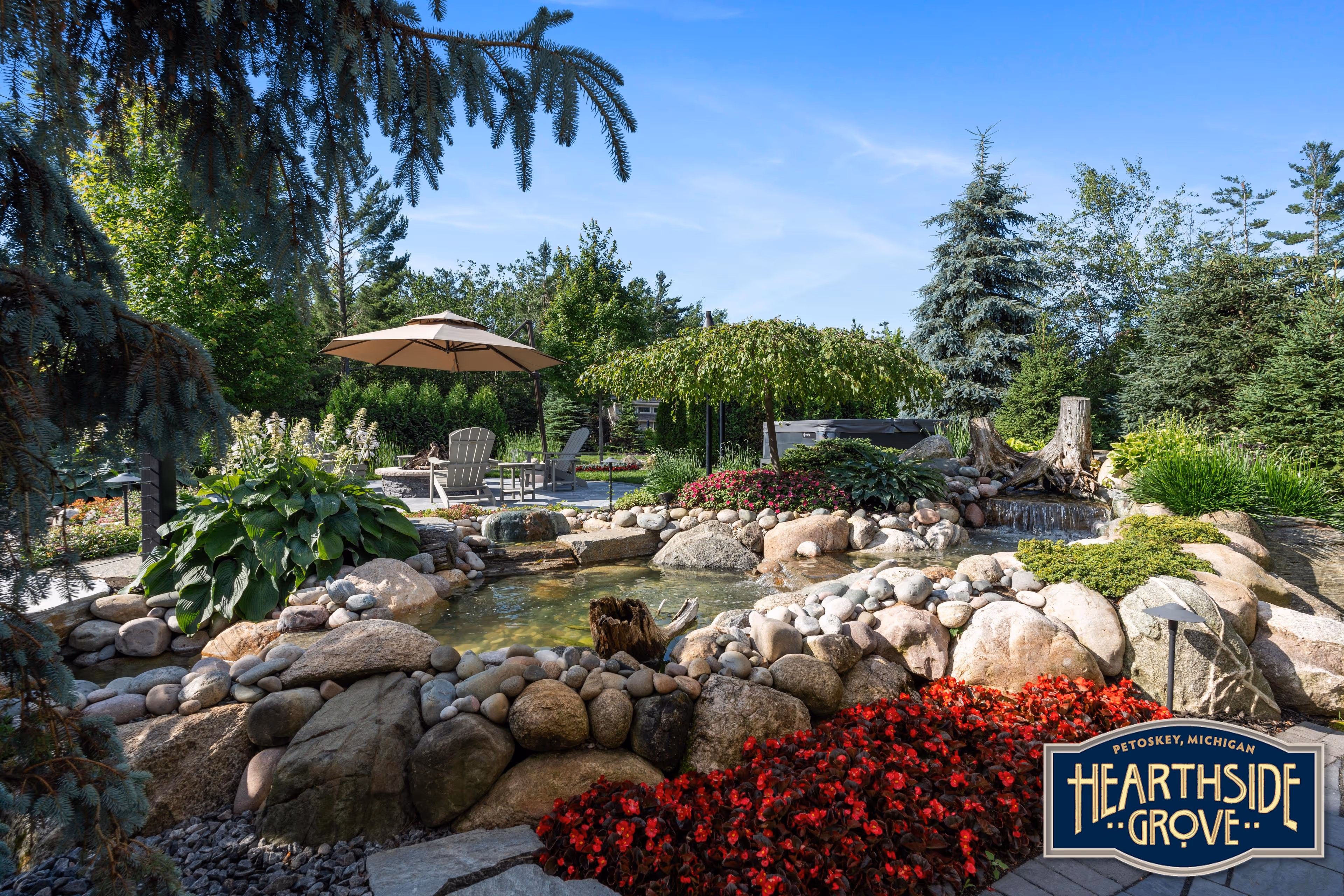 - Elevated firepit area accessible by a charming bridge across the stream.