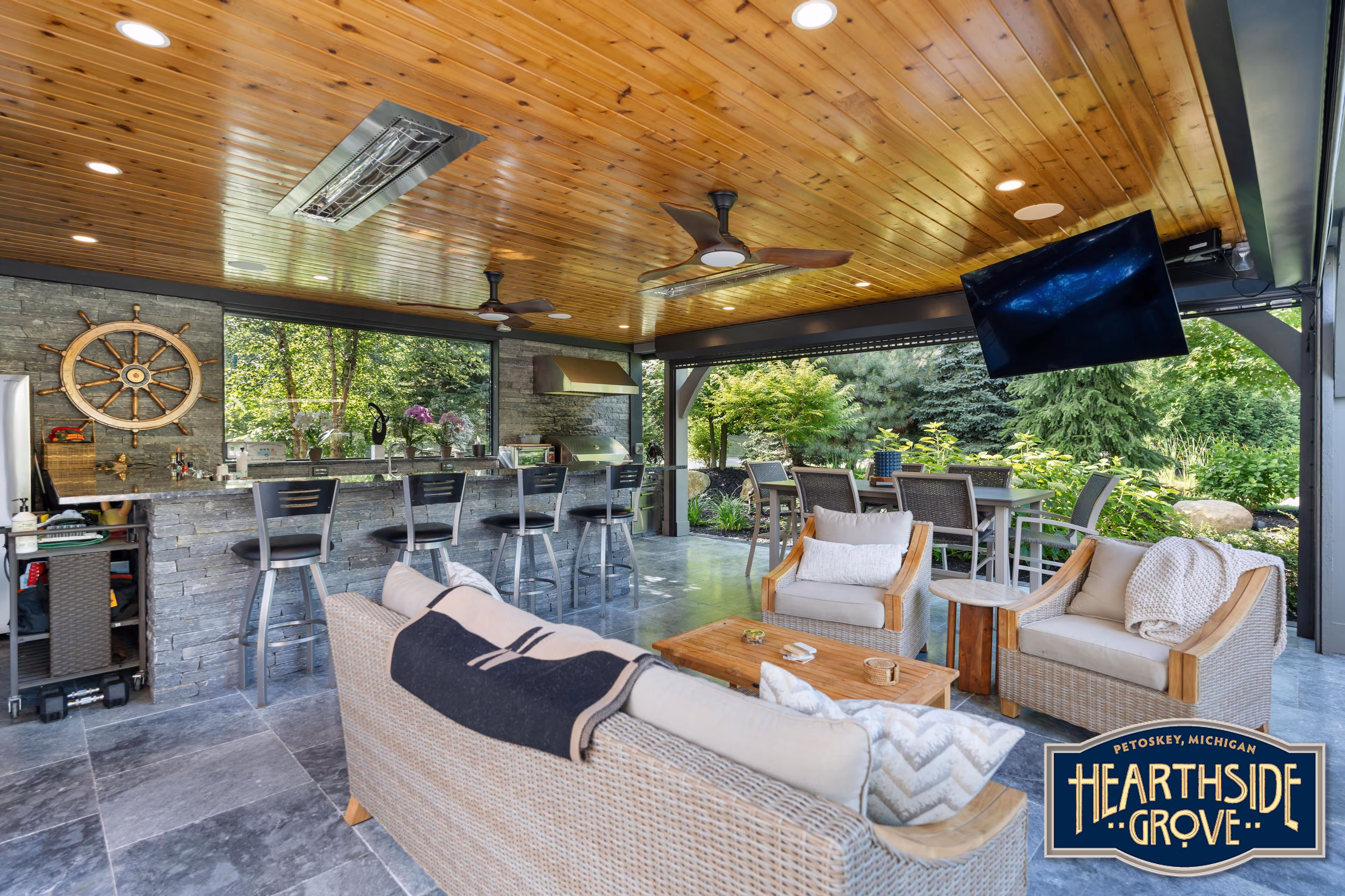 - Comprehensive outdoor kitchen with built-in grill, refrigerator, icemaker, and sink.