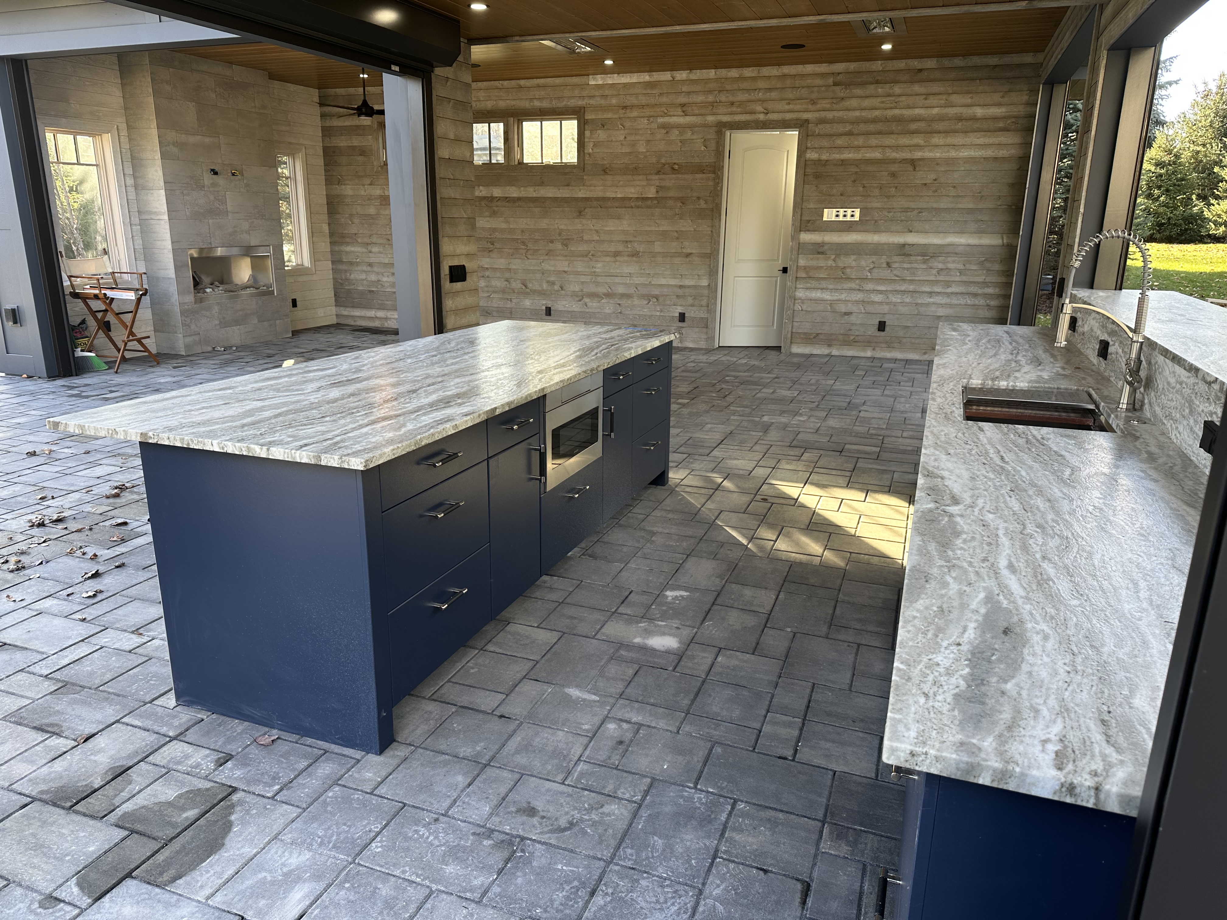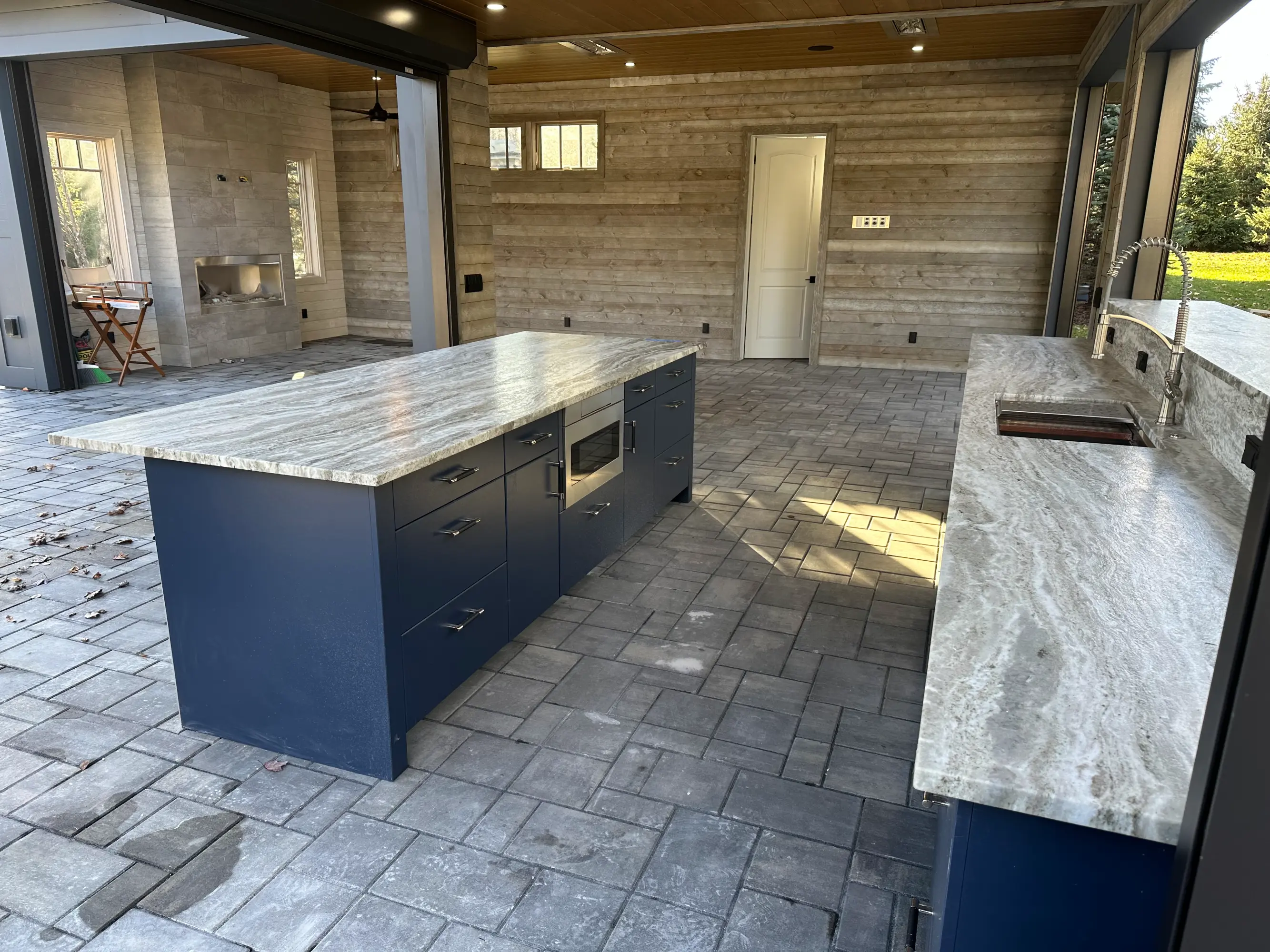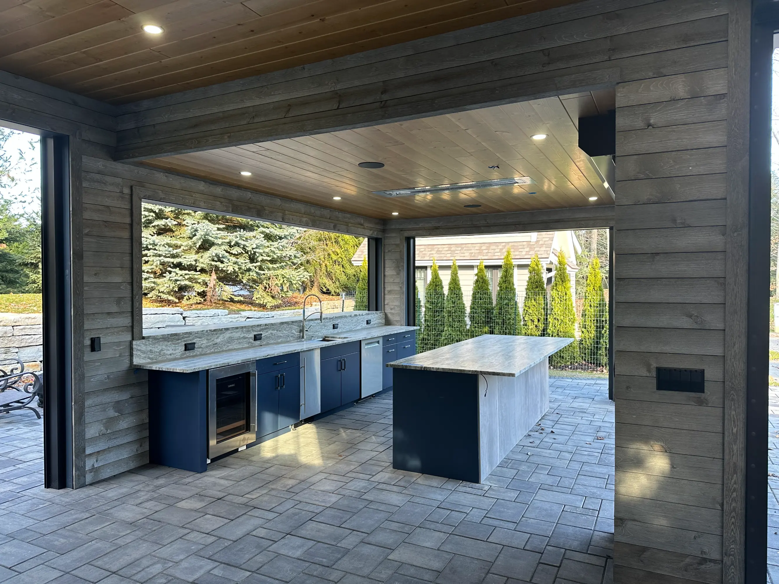 • Expansive outdoor kitchen with bar island for seating and prep space.