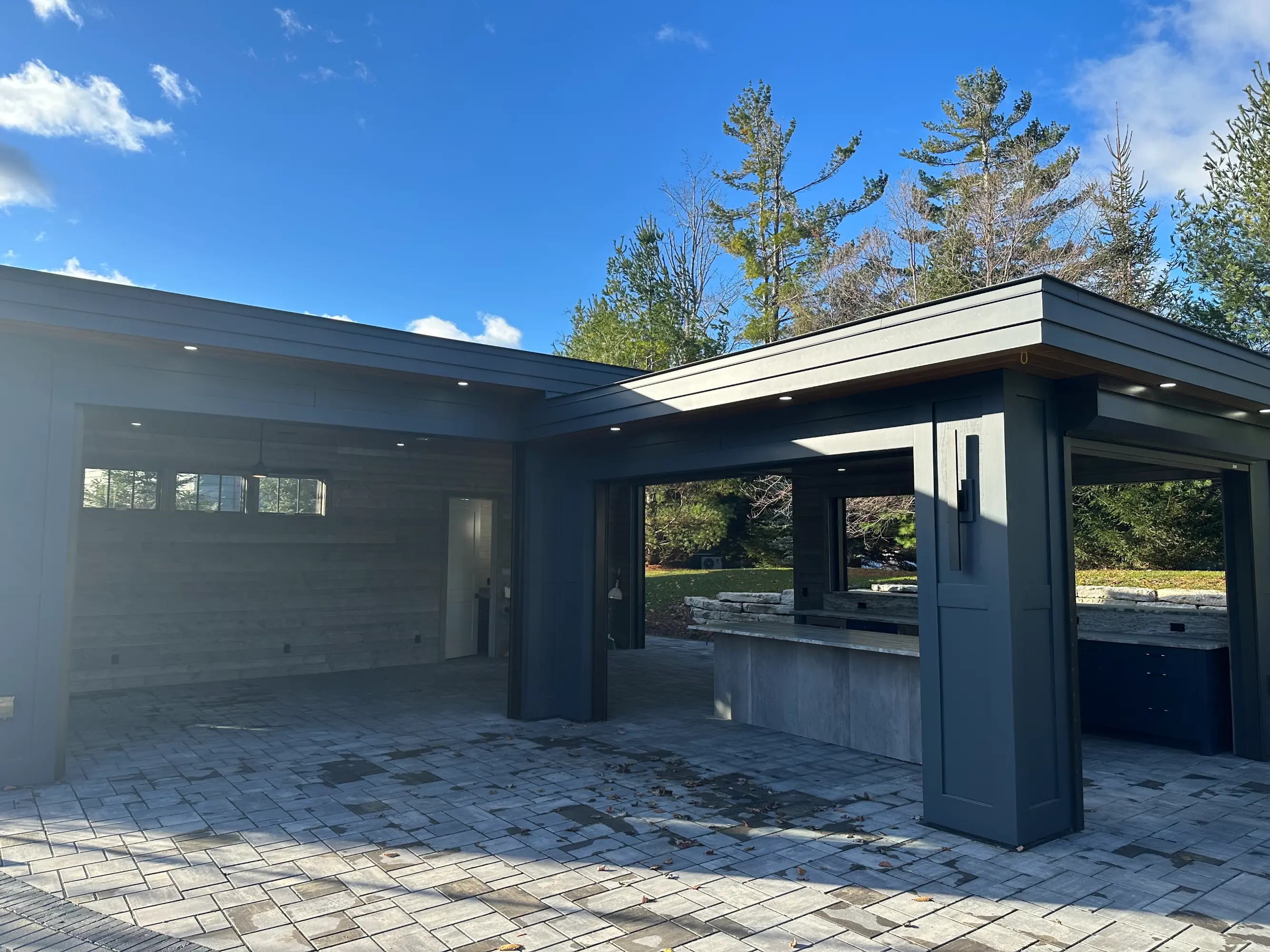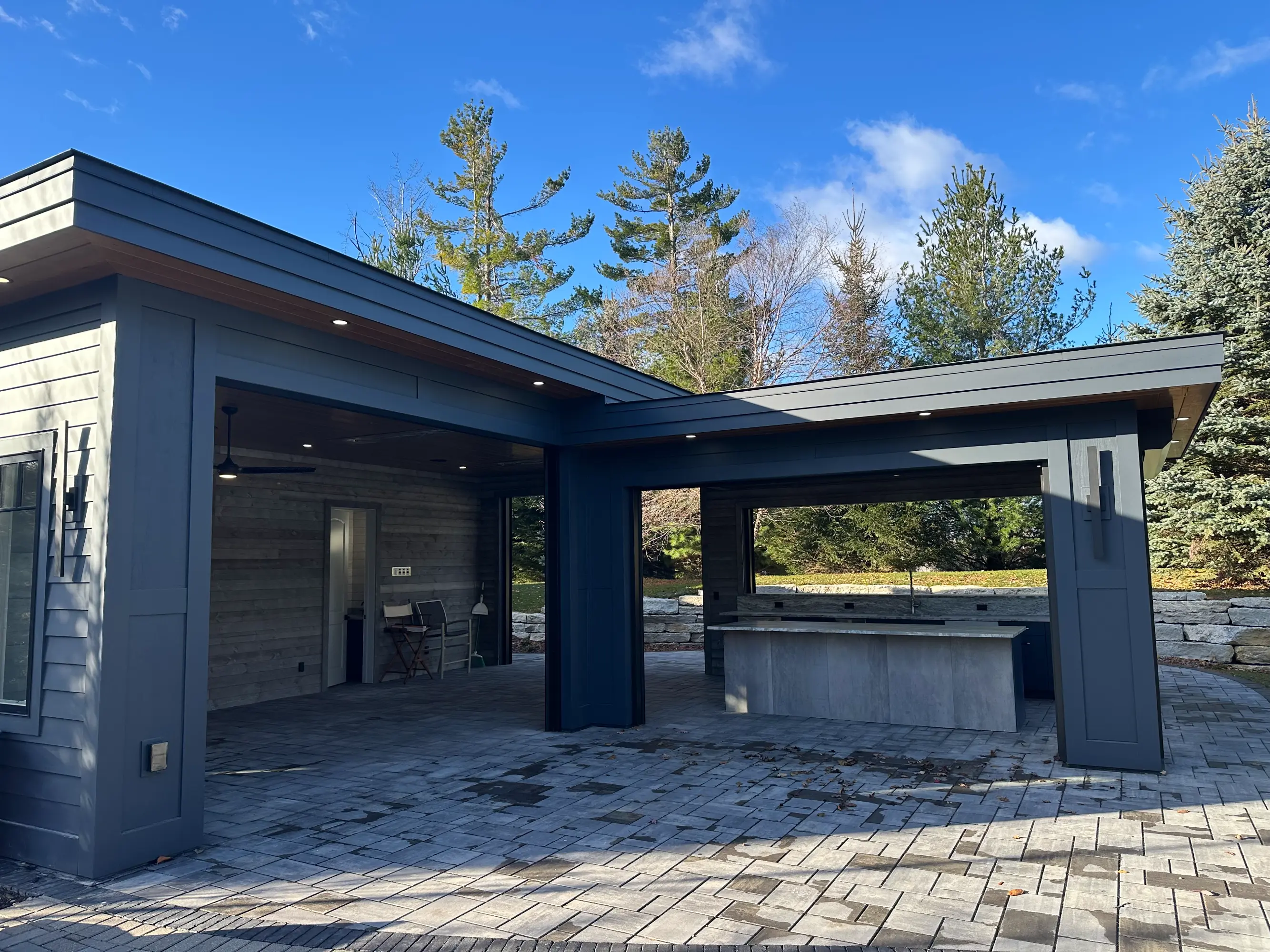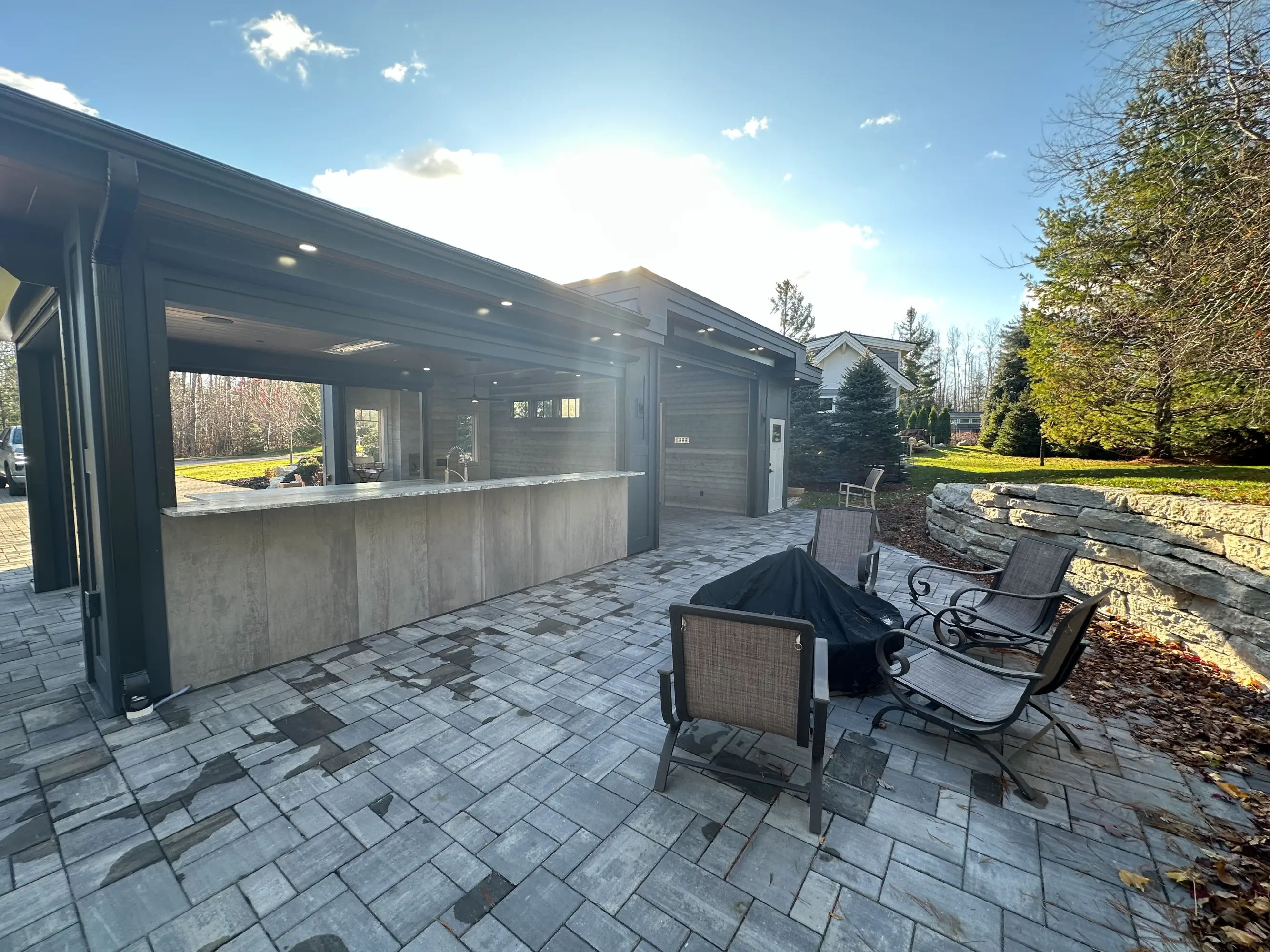 • Covered living space with ceiling heaters, fans, and ambient lighting for year-round enjoyment.