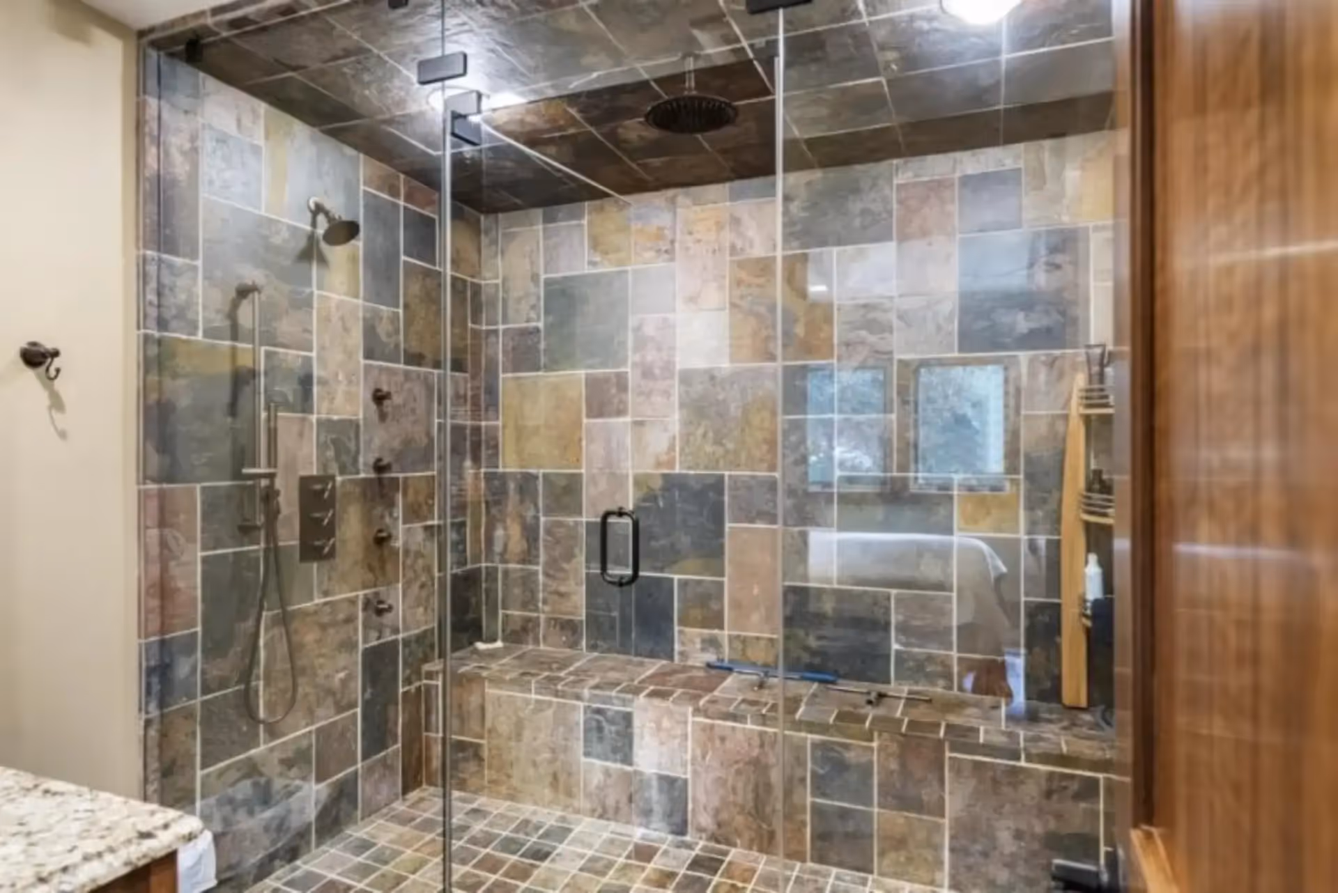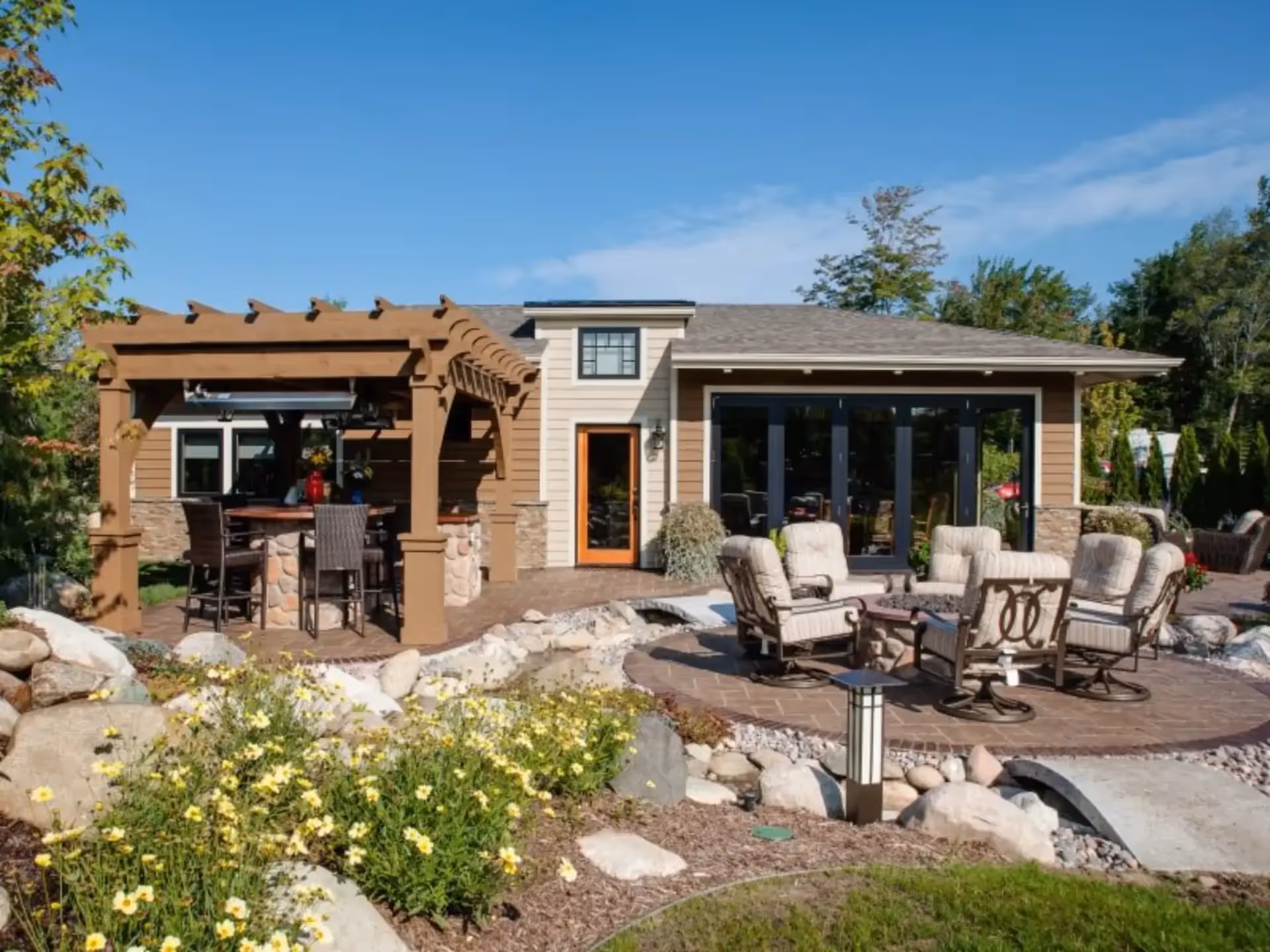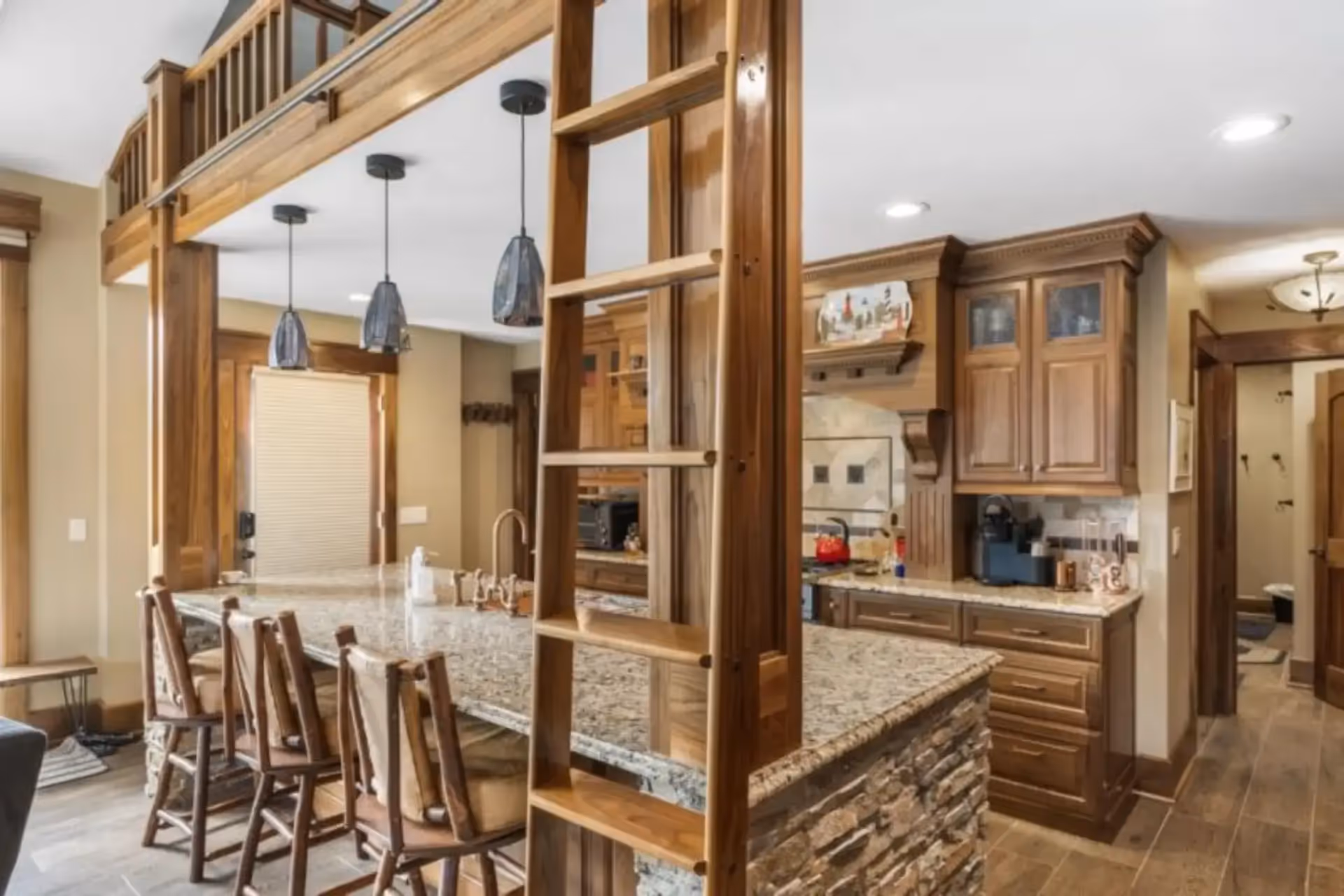 The fully finished bungalow has a lovely gourmet kitchen with granite countertops and amish solid walnut cabinets and trim. The living area features a collapsable glass door wall, ideal indoor-outdoor living and easy access to the outdoor bar with solid surface countertops, bbq area, and fire pit. The living space also offers a projector and a retractable projection screen above a cozy fireplace, perfect for entertaining. In addition, the bungalow has a bedroom with a queen bed and attached full bathroom with his-and-hers sinks and a steam shower. For guests, the bungalow has a half bath as well as a spacious loft with queen mattress and tv.