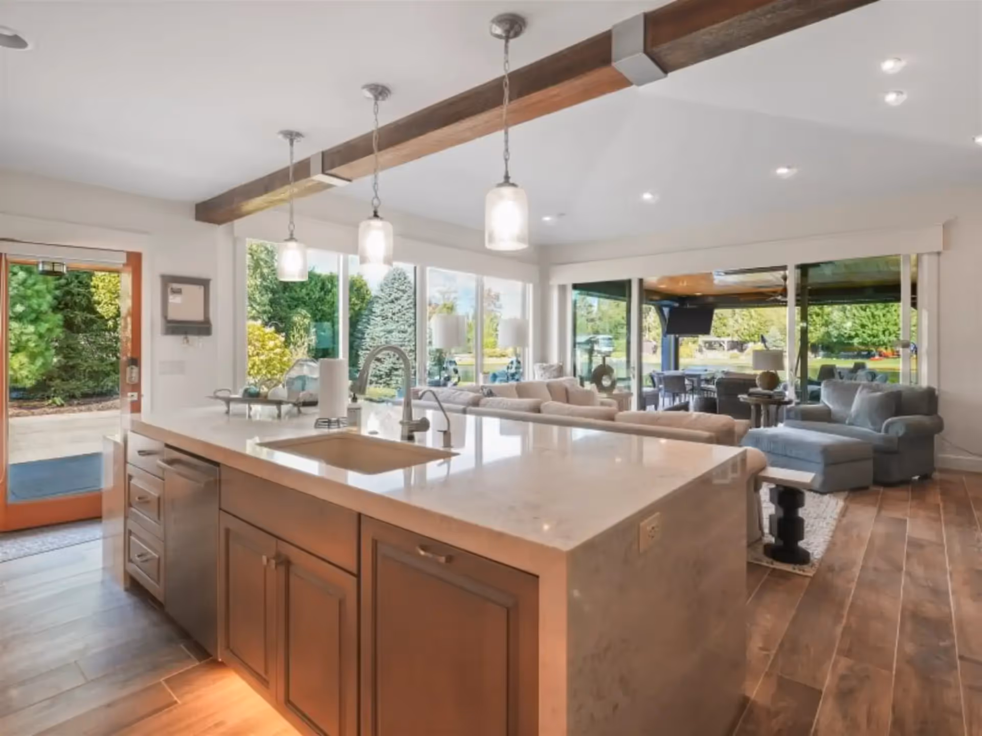 • Open-concept kitchen and living area that flows seamlessly to the pergola through large sliding glass doors.