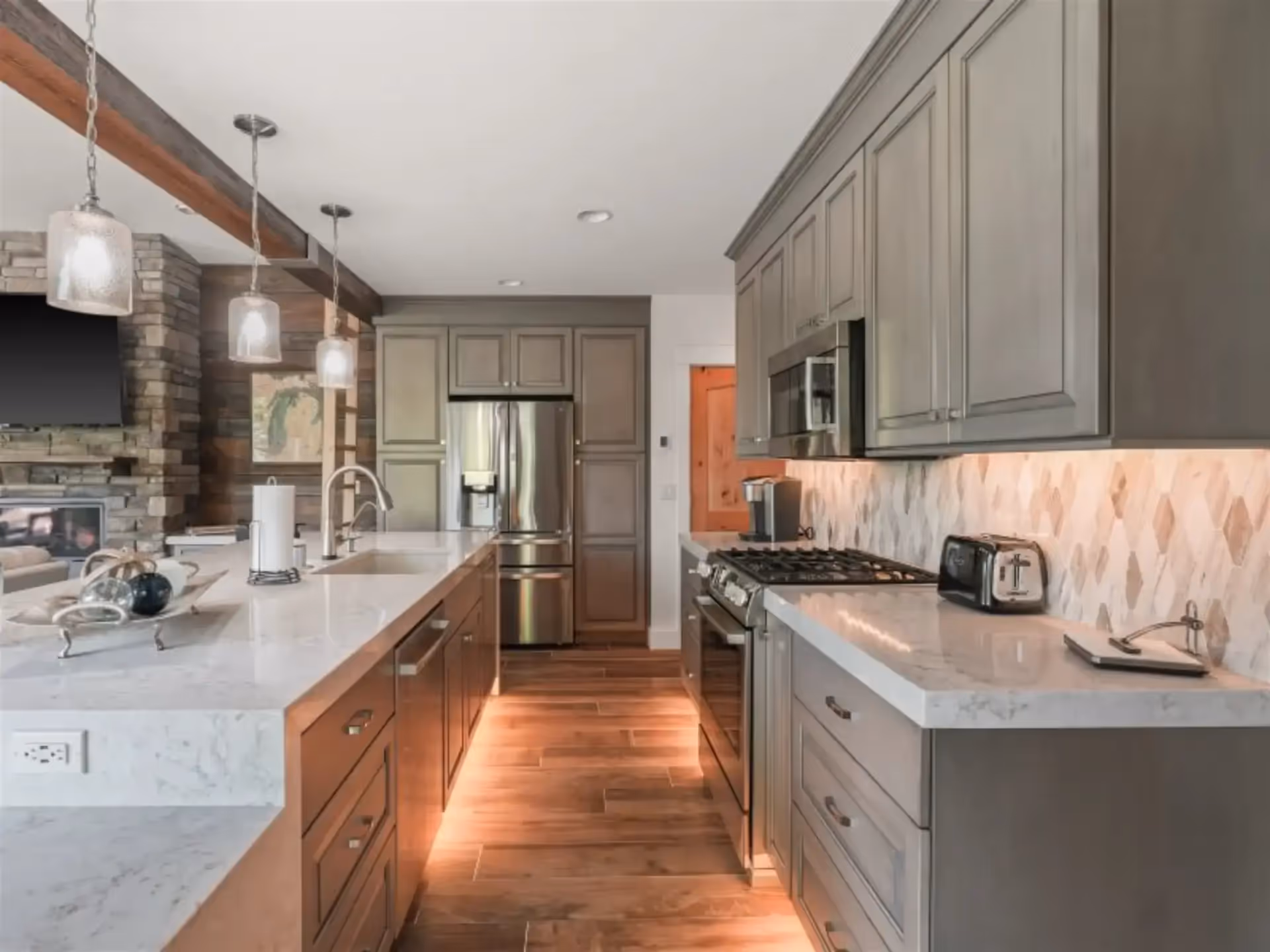 • Full chef’s kitchen with waterfall-edge marble island, seating on two sides, and high-end appliances.