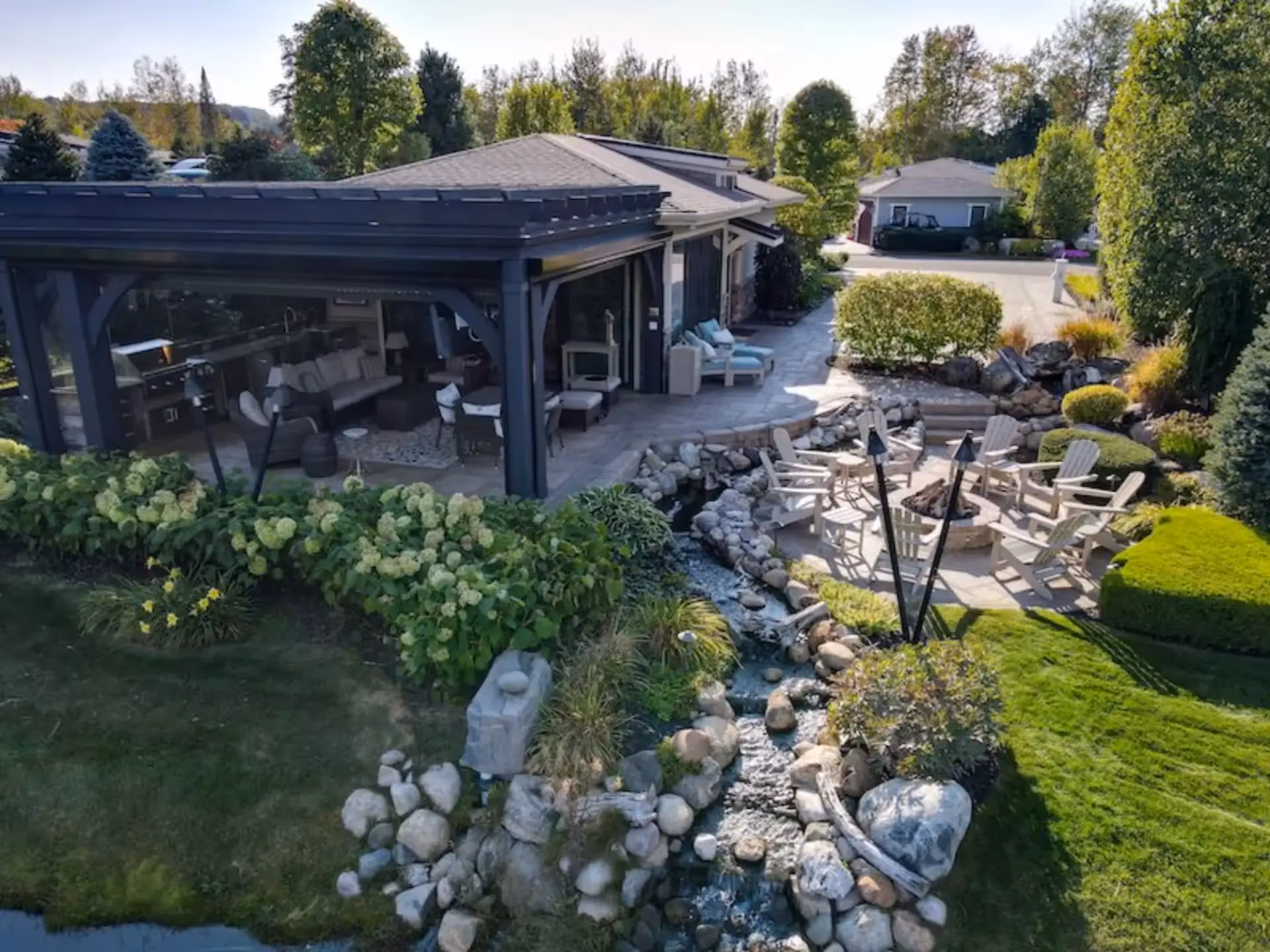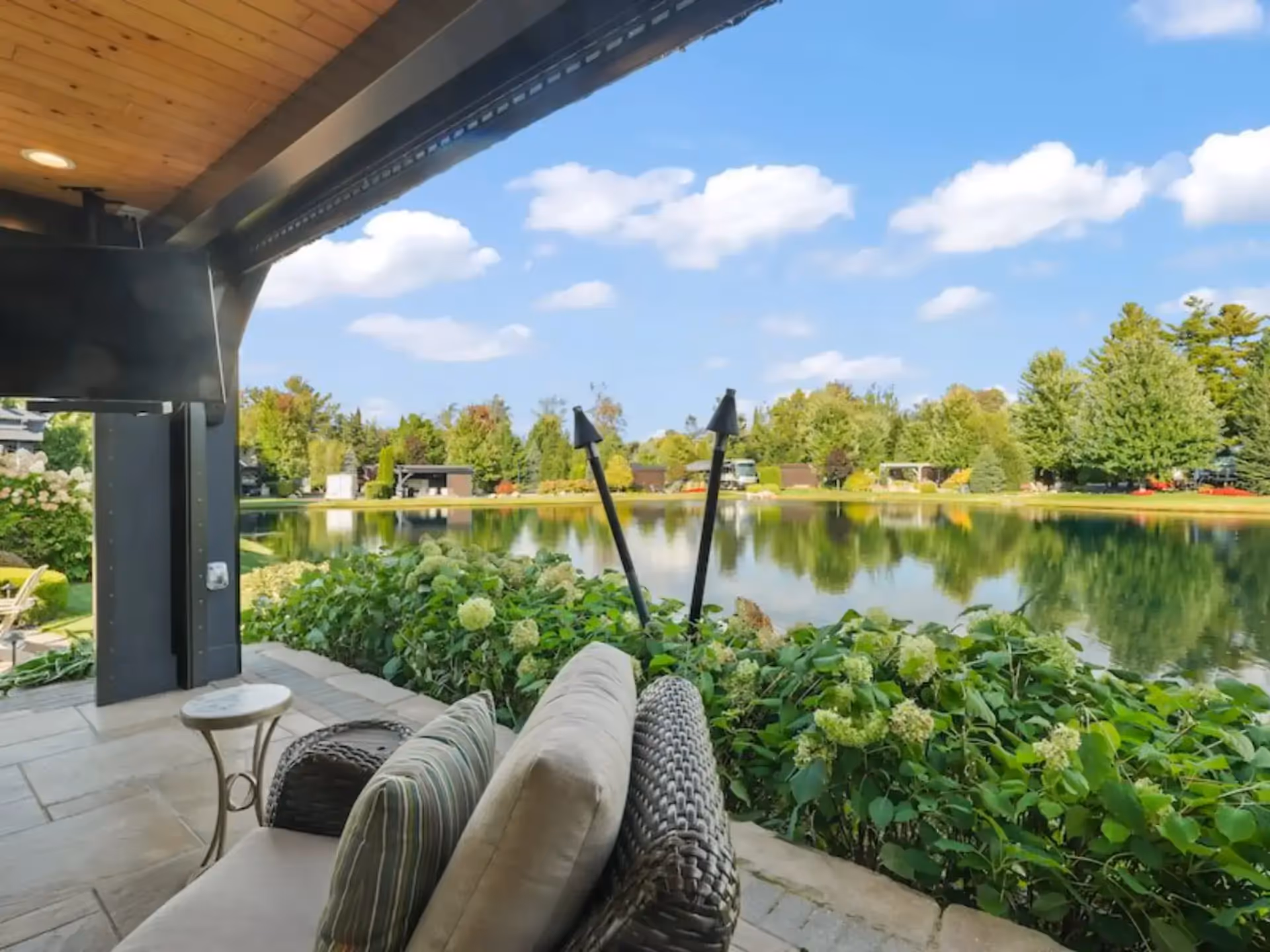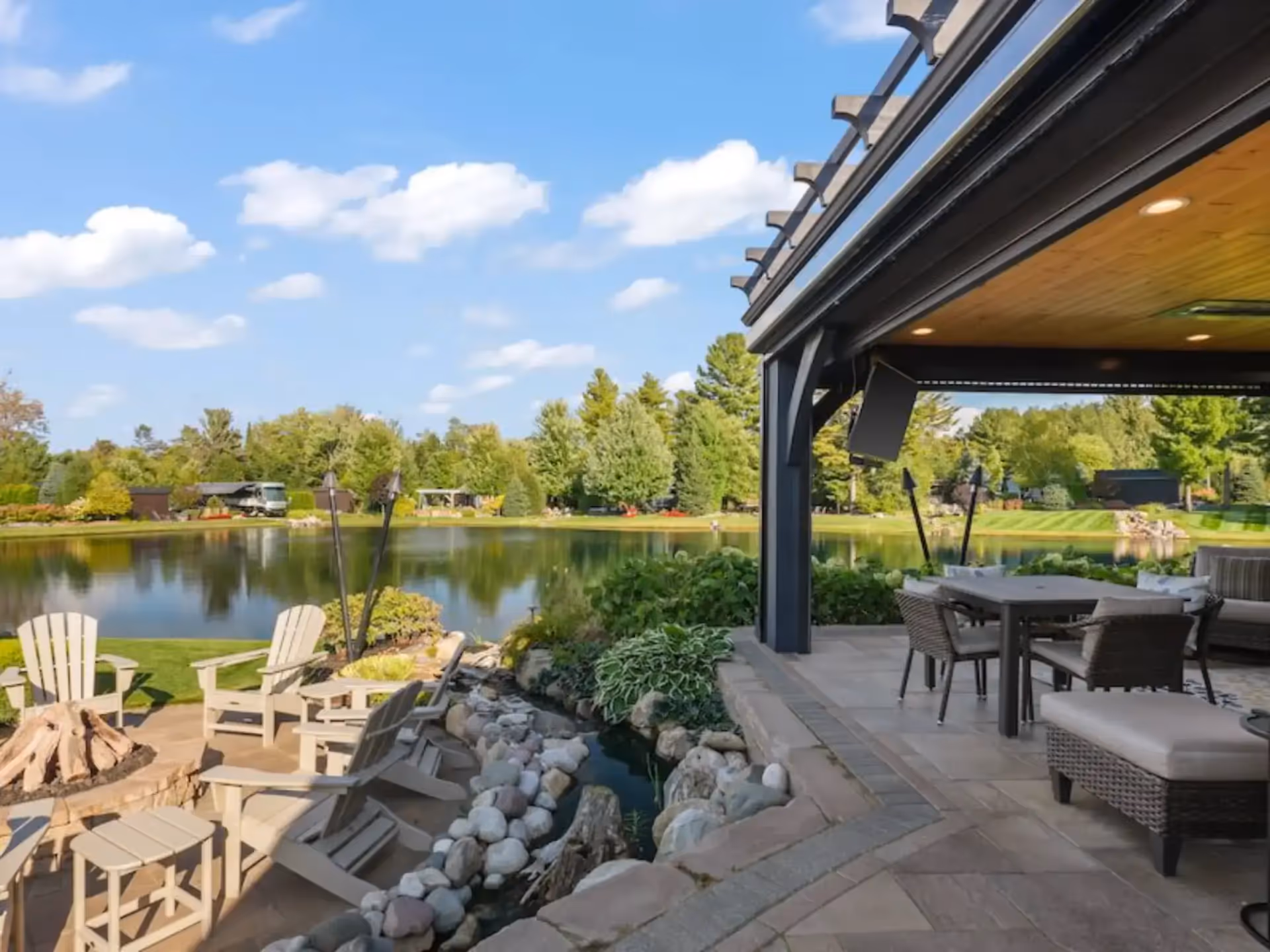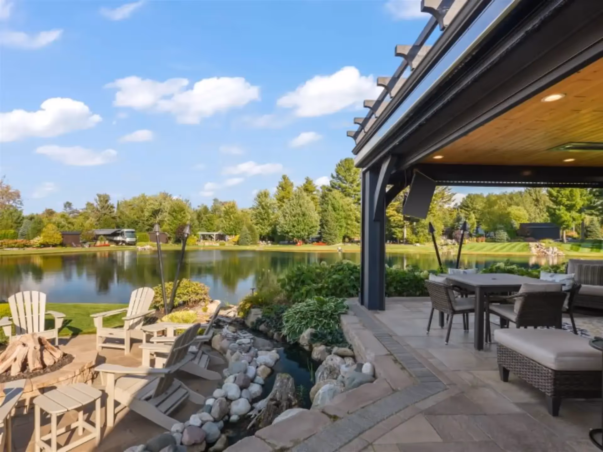 • Firepit patio directly overlooking the pond, surrounded by Adirondack seating for breathtaking views.