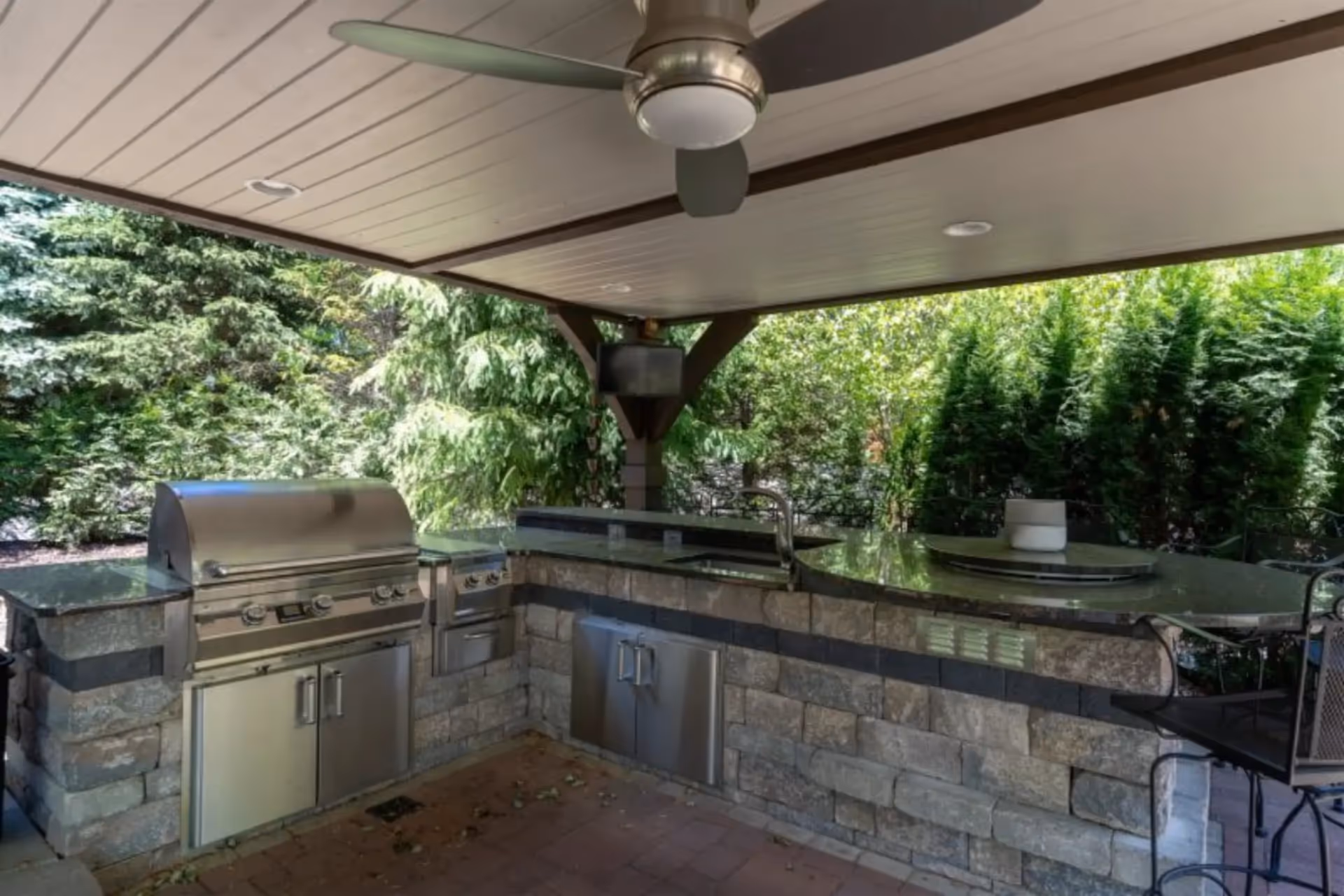 - Full outdoor kitchen featuring Aurora BBQ grill, double burner, granite countertop, and sink for effortless outdoor dining.