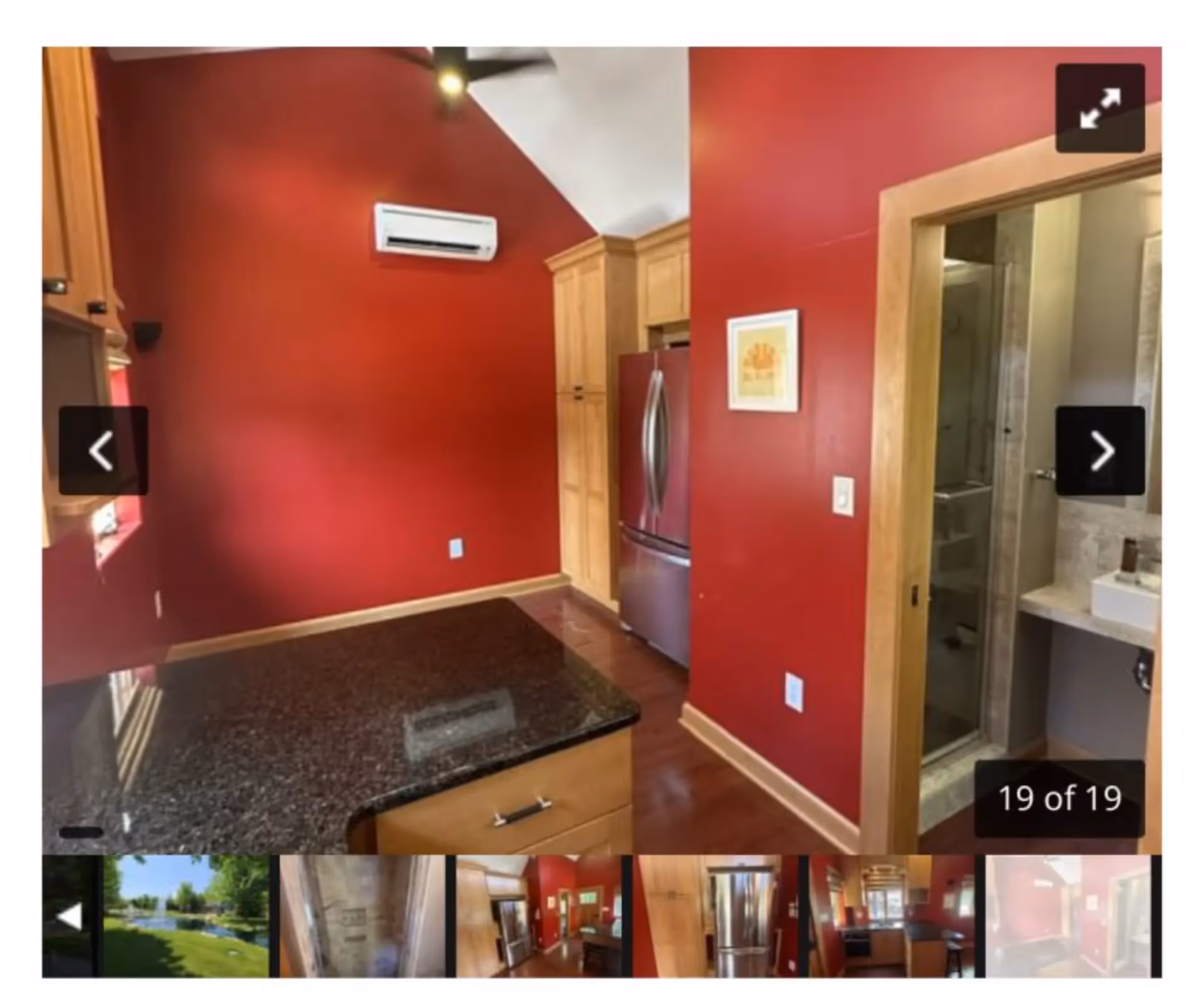 - Accent walls pair with warm maple cabinetry and sleek granite countertops.