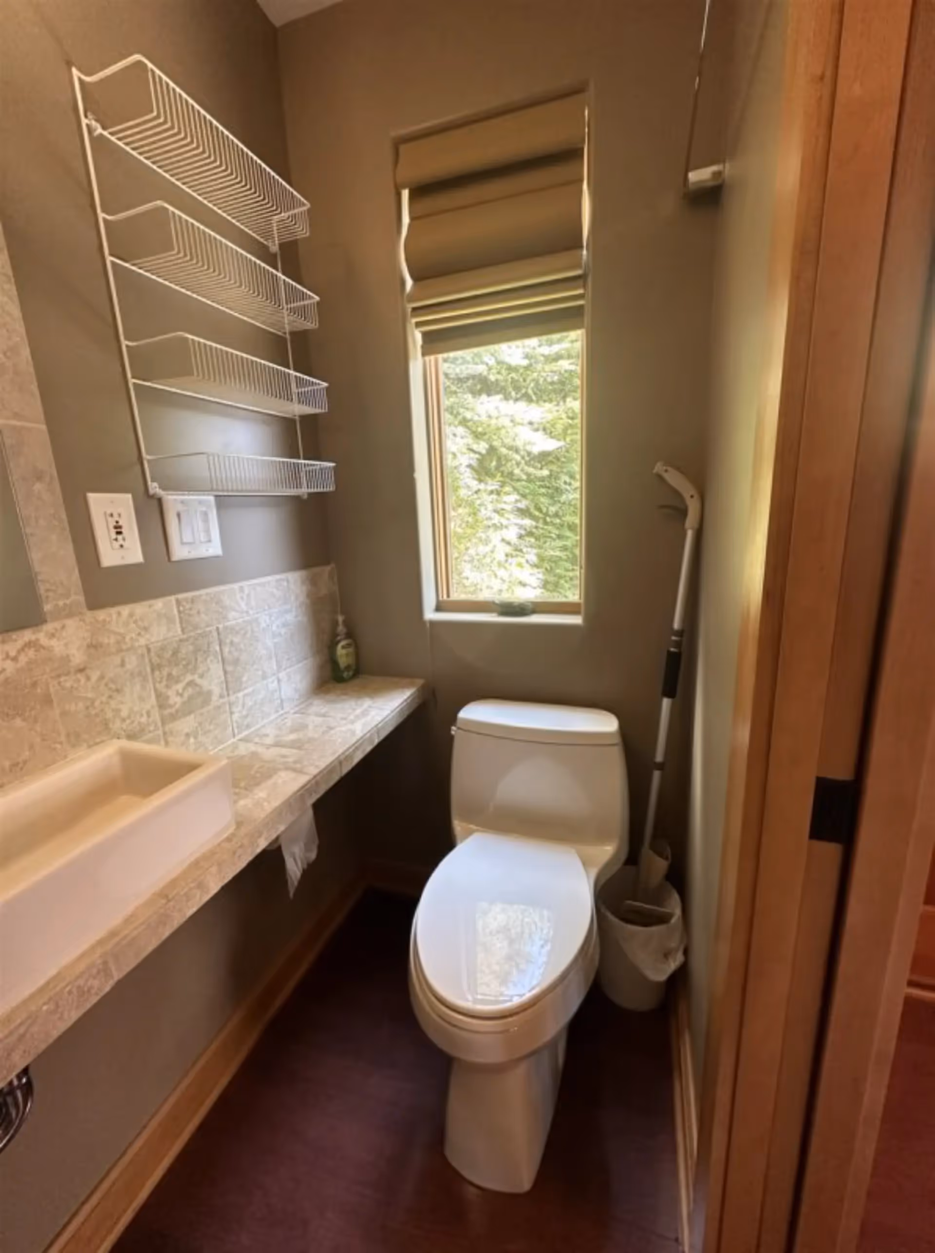 - Bathroom includes a stylish floating sink, stone tile details, and natural light from a large window.