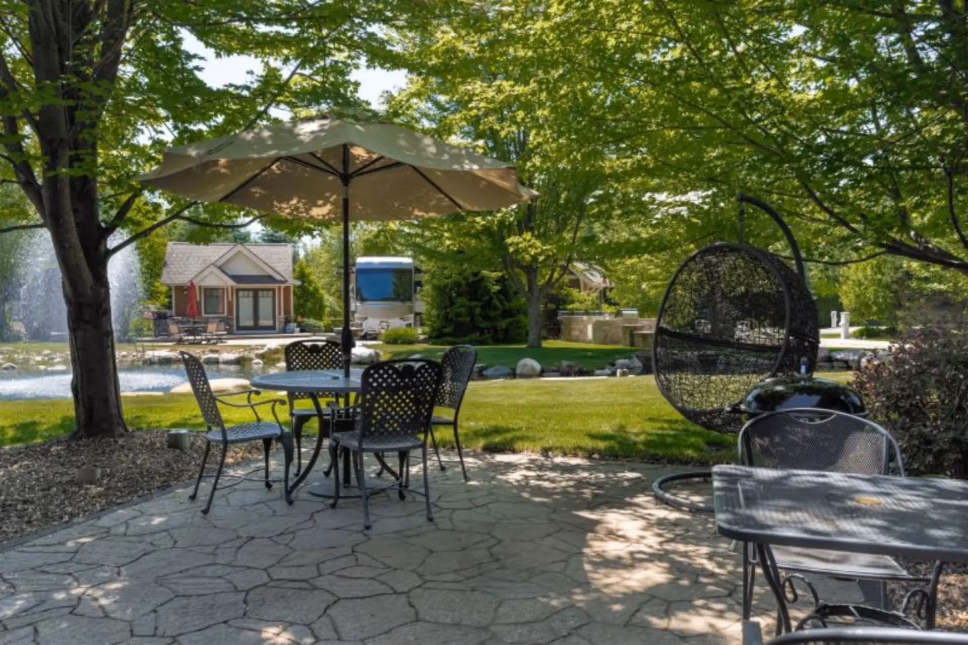 - Expansive patio areas allow for both sun-filled mornings and shaded afternoons.