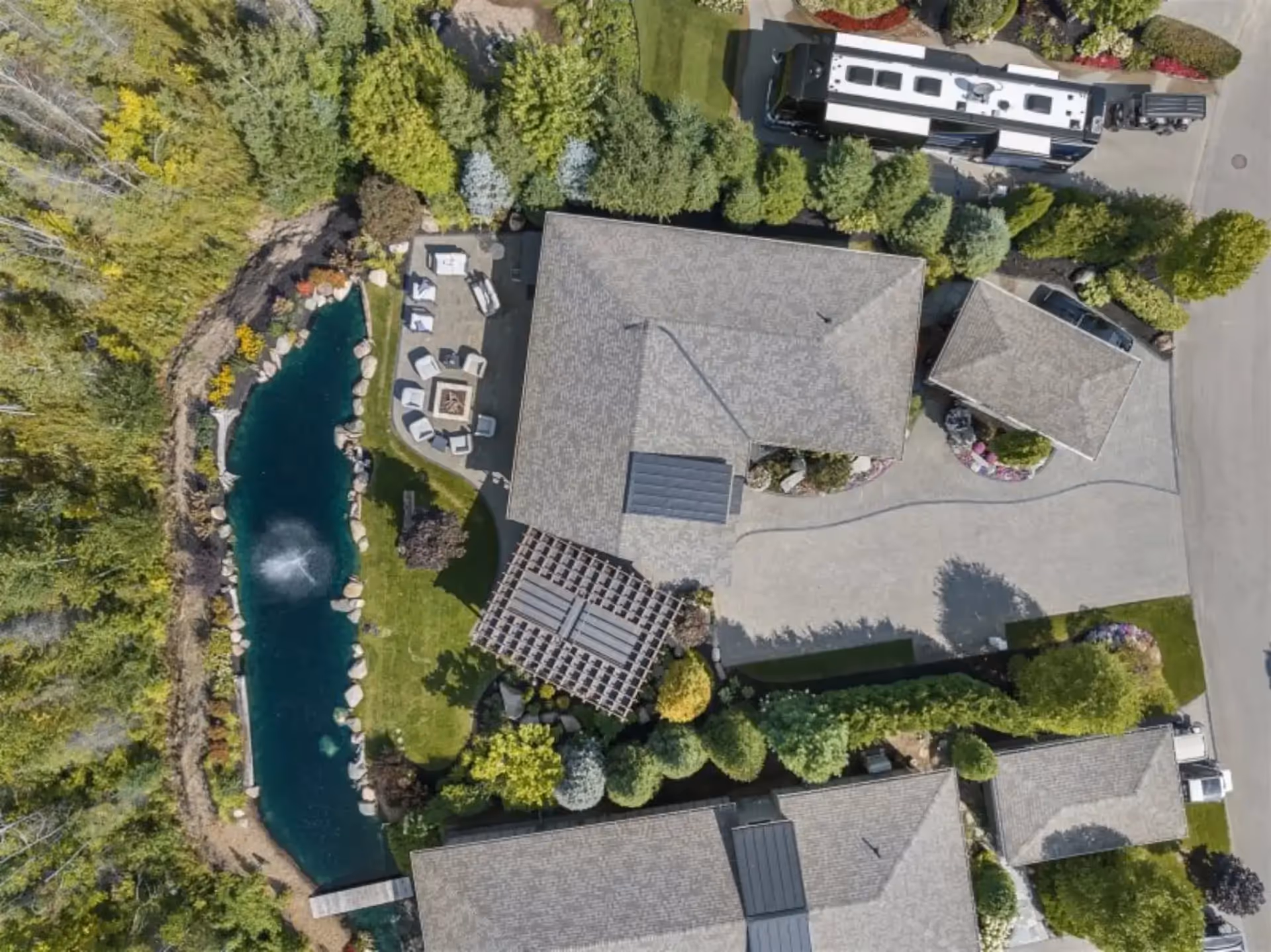 - Hand-crafted pergola with built-in heaters, recessed lighting, ceiling fan, and motorized western shade for year-round use.