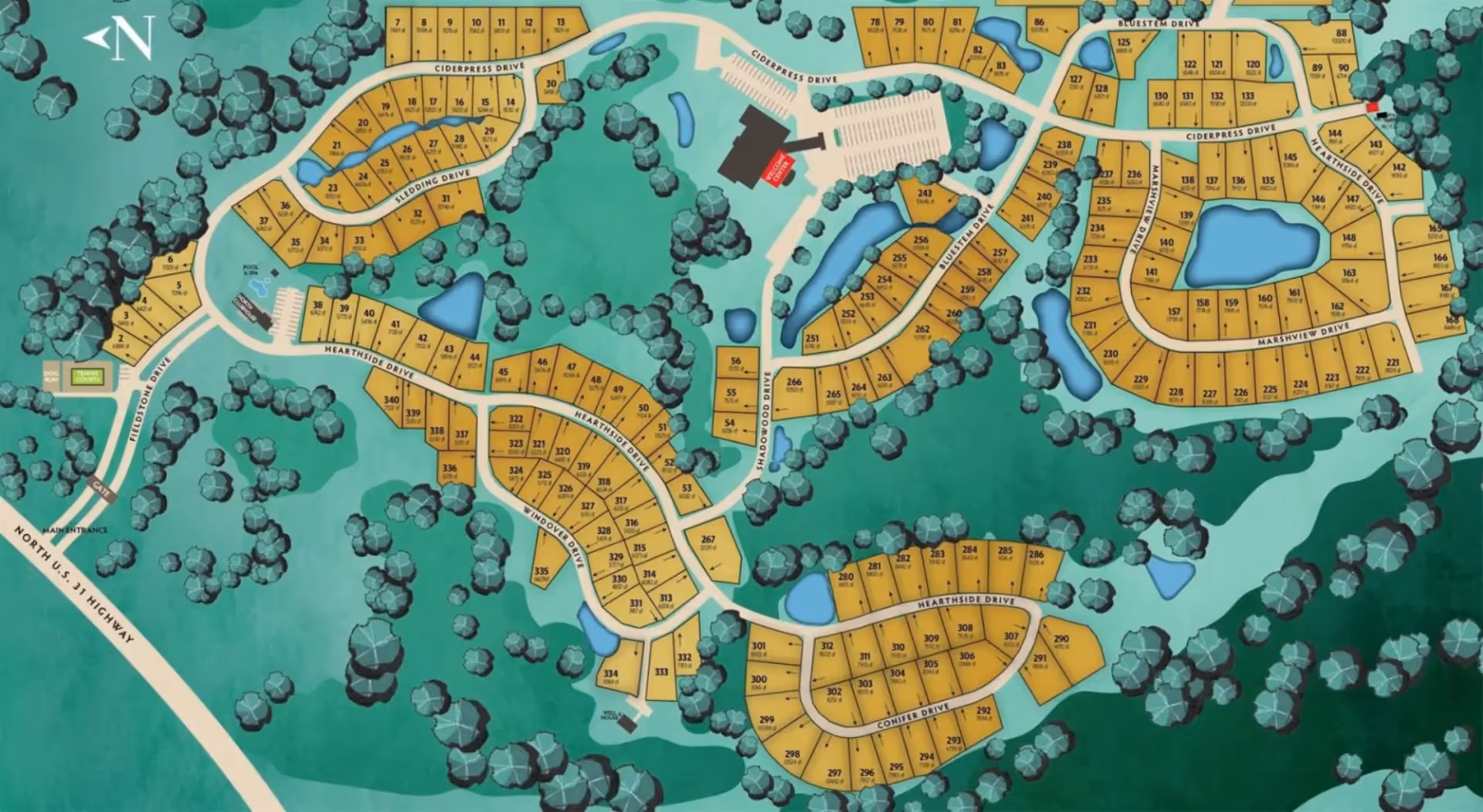 Lot 293 offers the perfect balance of modern functionality and natural beauty, located in Hearthside Grove’s newest neighborhood. Surrounded by majestic hardwoods and cedars, this spacious back-in lot provides a peaceful retreat with a generous motorcoach pad, stylish outdoor living space, and reliable connectivity. Its east-facing orientation captures the warmth of morning sunrises while offering refreshing shade in the afternoons—an ideal setting for both relaxation and productivity.
