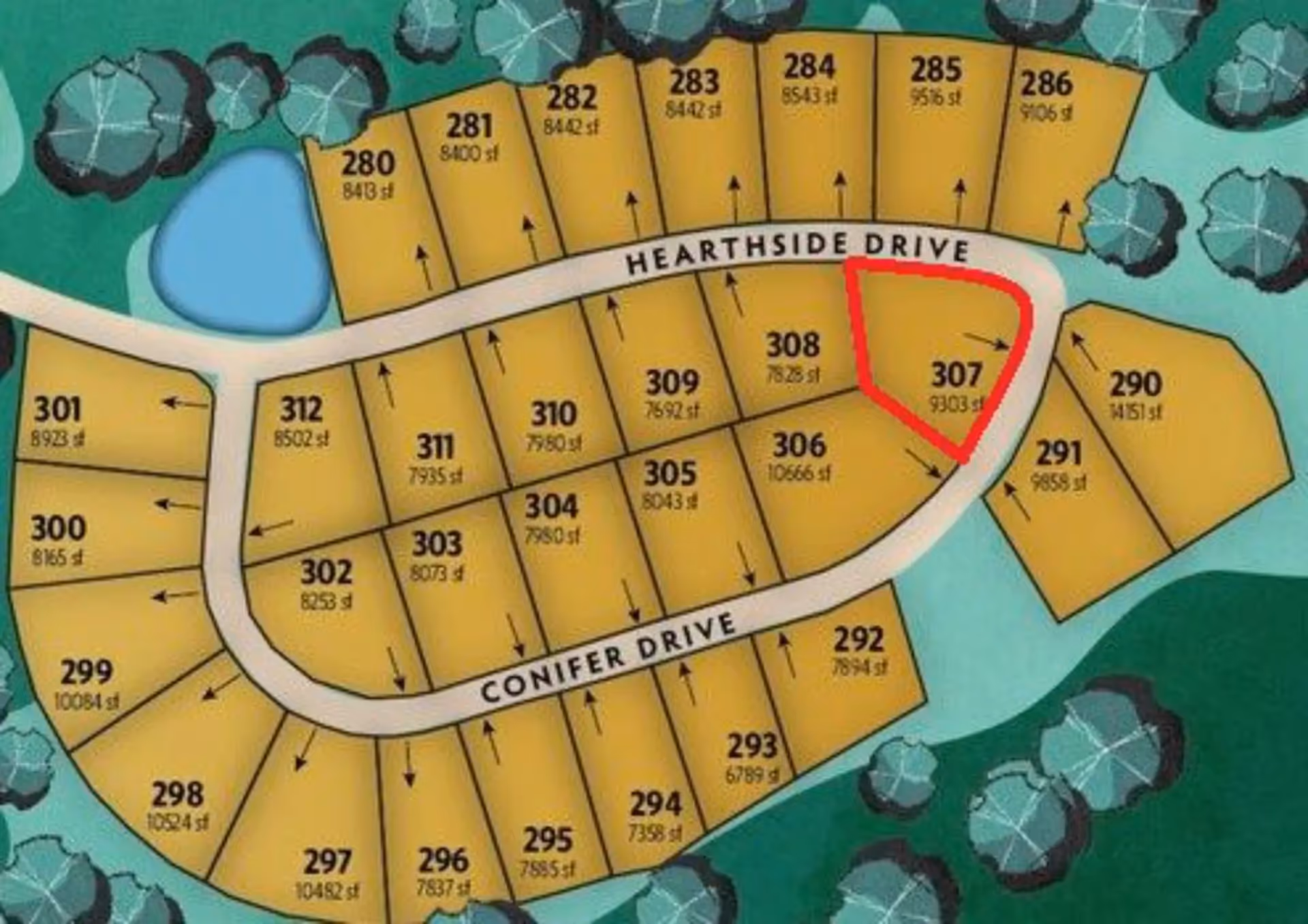 Lot 307 combines the serene wooded charm of Hearthside Grove with modern conveniences to create a versatile retreat. From mornings spent watching the sunrise to afternoons entertaining in shaded comfort, this lot is designed to fit a variety of lifestyles.