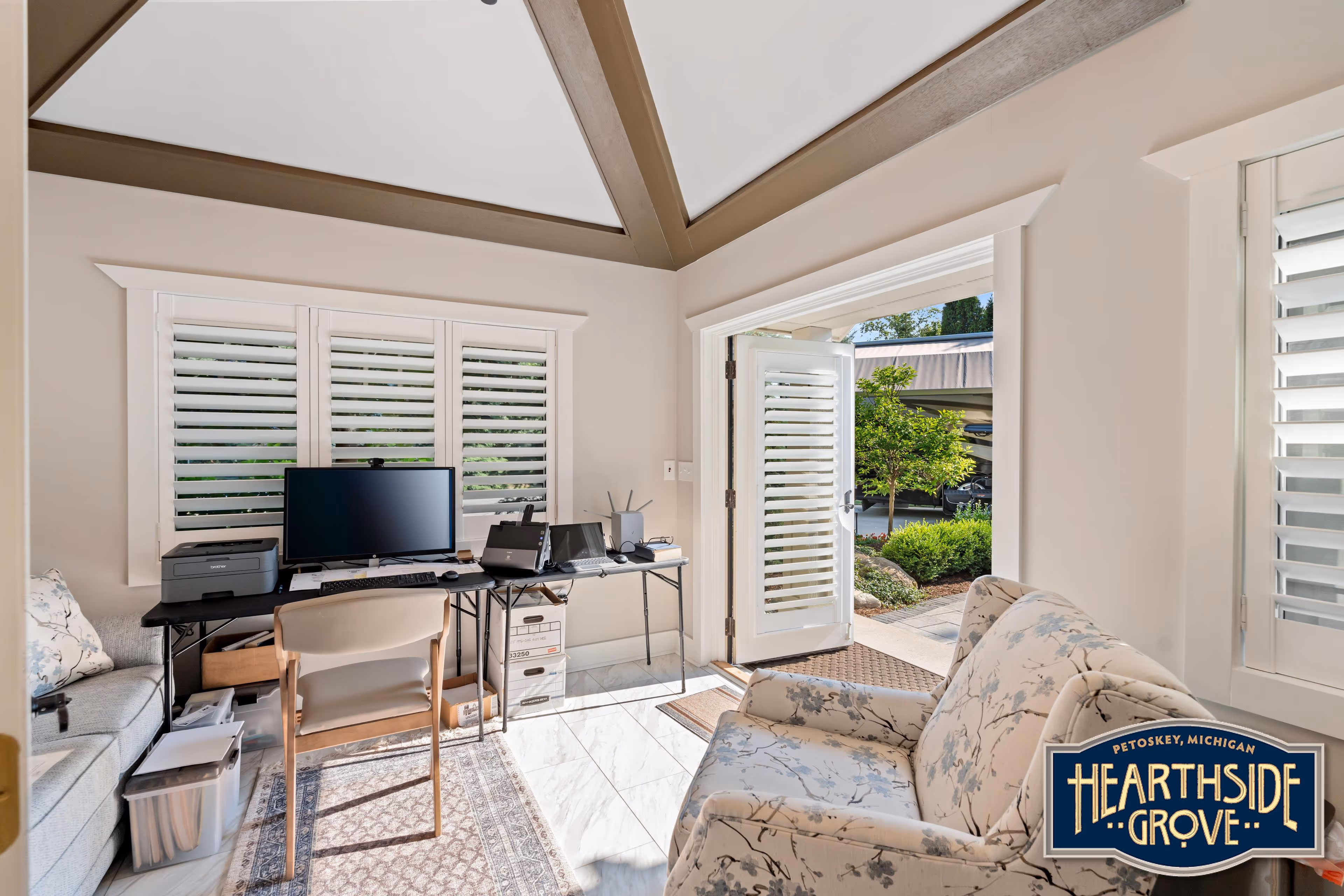 - Open layout with sofa, workspace, and abundant natural light from French doors with plantation shutters.