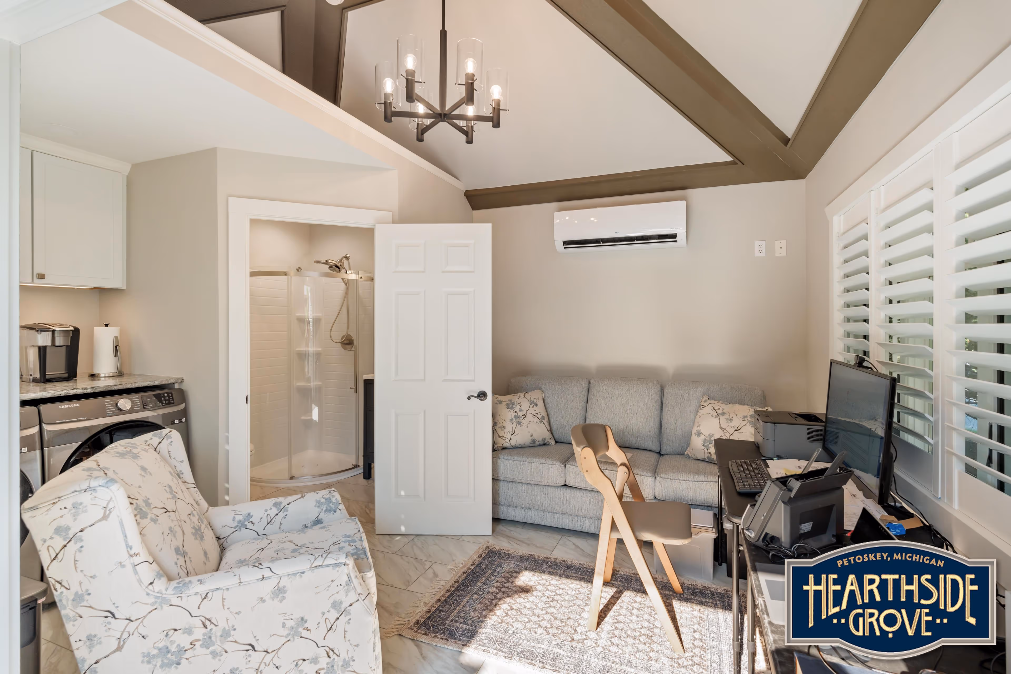 - Efficient mini-split heating and cooling system provides year-round comfort.
