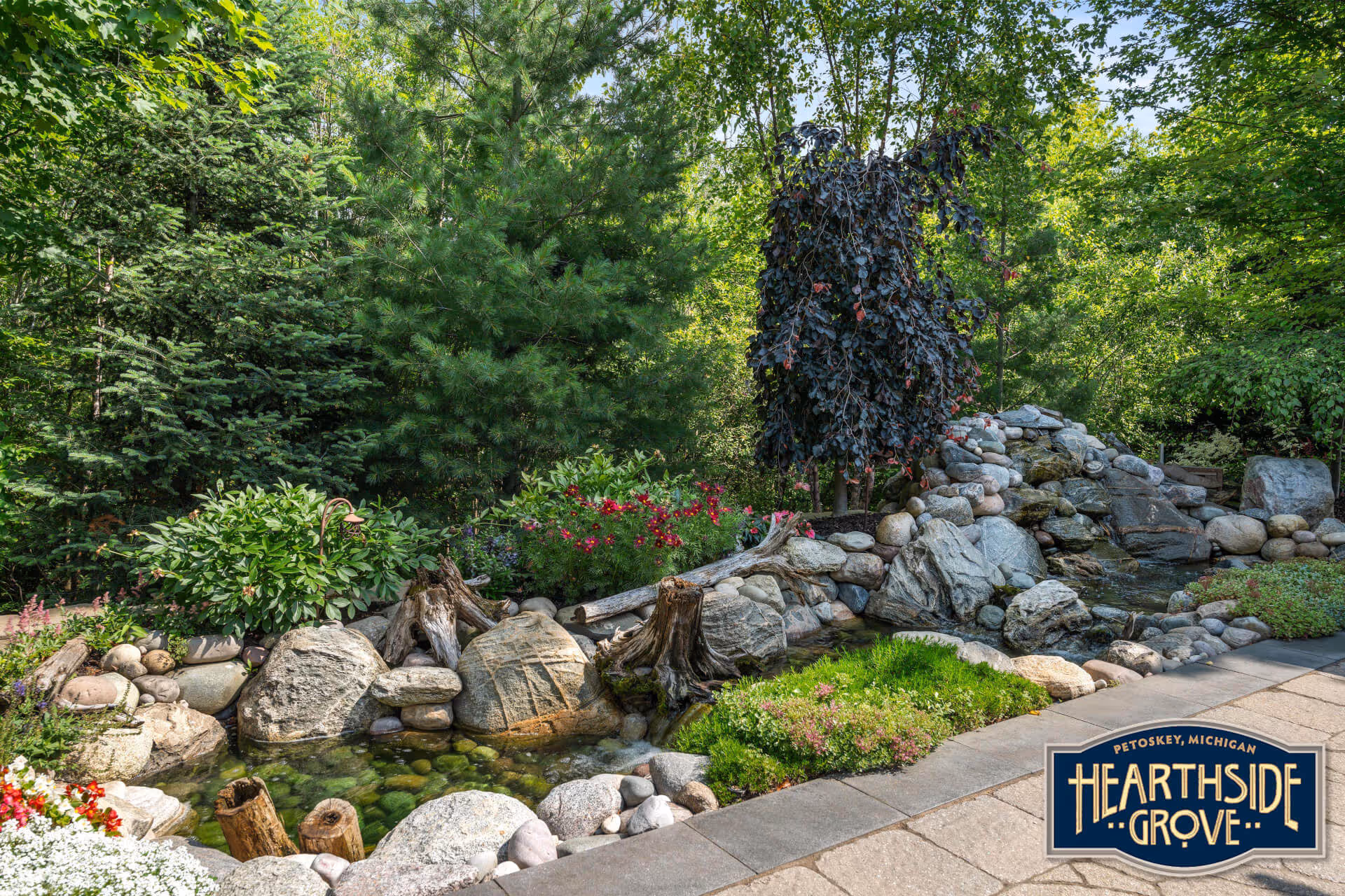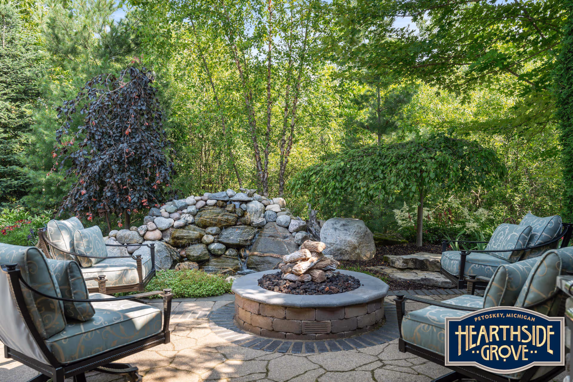 - Remote-controlled firepit adjacent to the water feature for cozy gatherings.
